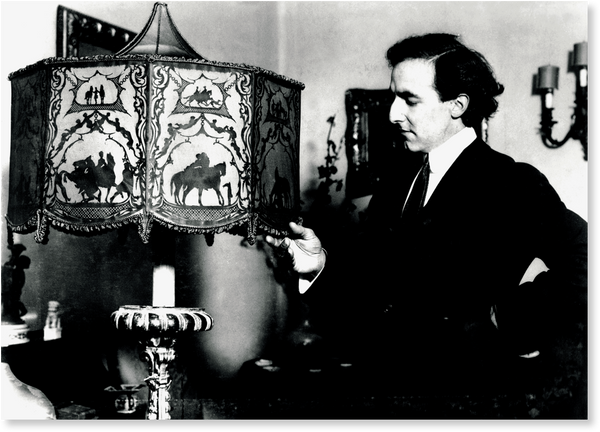 Mochi’s lampshade designs began with a scene cut from black paper, then filled behind with a single piece of silk, producing a marvelous effect when lit. The lampshades were just the beginning of Mochi's stunning silk works. His increasingly complex designs, using rich multicolored cut silk, created the illusion of stained-glass.
